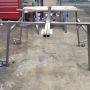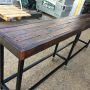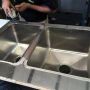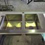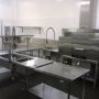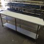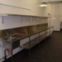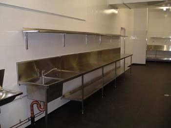This is a long stainless steel bench that was fabricated for a commercial kitchen application. It includes a separate stainless steel overhead shelf and brackets, stainless steel sink and single tier under shelf. For this bench we included a wet edge profile around the sink and a full length stainless steel splashback.